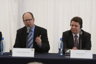 Do nabrzeża terminala DCT w Porcie Północnym wpłynął największy kontenerowiec w historii gdańskich przeładunków. 366 metrowy gigant Maersk Elba może przewieźć na swoim pokładzie 13092 kontenerów (TEU). Gdyby w każdym kontenerze znajdowały się tylko banany, to na każdego Polaka przypadałoby 16 szt. tego owocu. Dzięki swojej masie po rozpędzeniu Elby do maksymalnych 25 węzłów, a następnie wyłączeniu silników statek przepłynąłby jeszcze ok. 15 km. Nz. od lewej: Paweł Adamowicz (Prezydent Gdańska), Boris Wenzel (Prezes DCT Gdańsk)