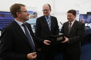 Do nabrzeża terminala DCT w Porcie Północnym wpłynął największy kontenerowiec w historii gdańskich przeładunków. 366 metrowy gigant Maersk Elba może przewieźć na swoim pokładzie 13092 kontenerów (TEU). Gdyby w każdym kontenerze znajdowały się tylko banany, to na każdego Polaka przypadałoby 16 szt. tego owocu. Dzięki swojej masie po rozpędzeniu Elby do maksymalnych 25 węzłów, a następnie wyłączeniu silników statek przepłynąłby jeszcze ok. 15 km. Nz. po lewej Eivind Kolding (Prezes Maersk Line) i po prawej Boris Wenzel (Prezes DCT Gdańsk) wręczają Prezydentowi Gdańska Pawłowi Adamowiczowi 5 kilogramową rzeźbę przedstawiającą terminal kontenerowy