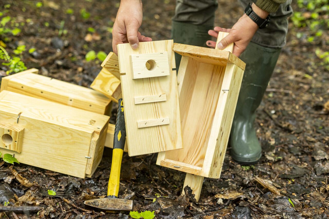 Gdańsk. W ramach Budżetu Obywatelskiego Pracownicy firmy MKW Pracownia, Bartosz Skrzypczak i Jakub Piechowiak zamontowali ponad 50 budek lęgowych dla ptaków w pasie zieleni pomiędzy ulicami F.Liszta, Starodworską i Kartuską.