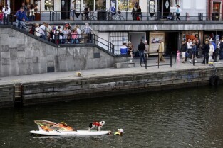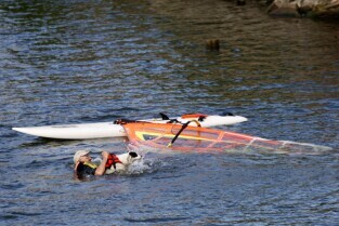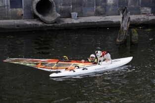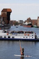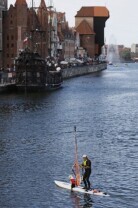 Gdańsk, rzeka Motława. Windsurfer z psem na desce próbuje odpłynąć od Zielonego Mostu w dół rzeki, jednakże przeszkadza mu przeciwnie wiejący wiatr