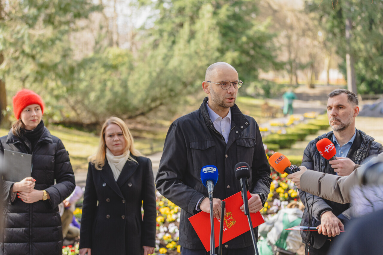 Gdańsk, Park Oliwski. Wiosenne porządkowanie miasta. W briefingu wzięli udział, Piotr Kryszewski, dyrektor zarządzający ds. Zielonego Gdańska, Barbara Tusk‑Krajewska, dyrektor Gdańskiego Zarządu Zieleni, Anna Wołodźko, dyrektor Wydziału Gospodarki Komunalnej