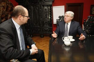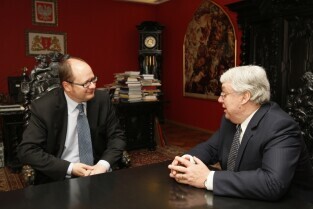 Ambasador Irlandii w Polsce Eugene Hutchinson spotkał się z Prezydentem Gdańska Pawłem Adamowiczem. Gdańsk, Urząd Miejski.