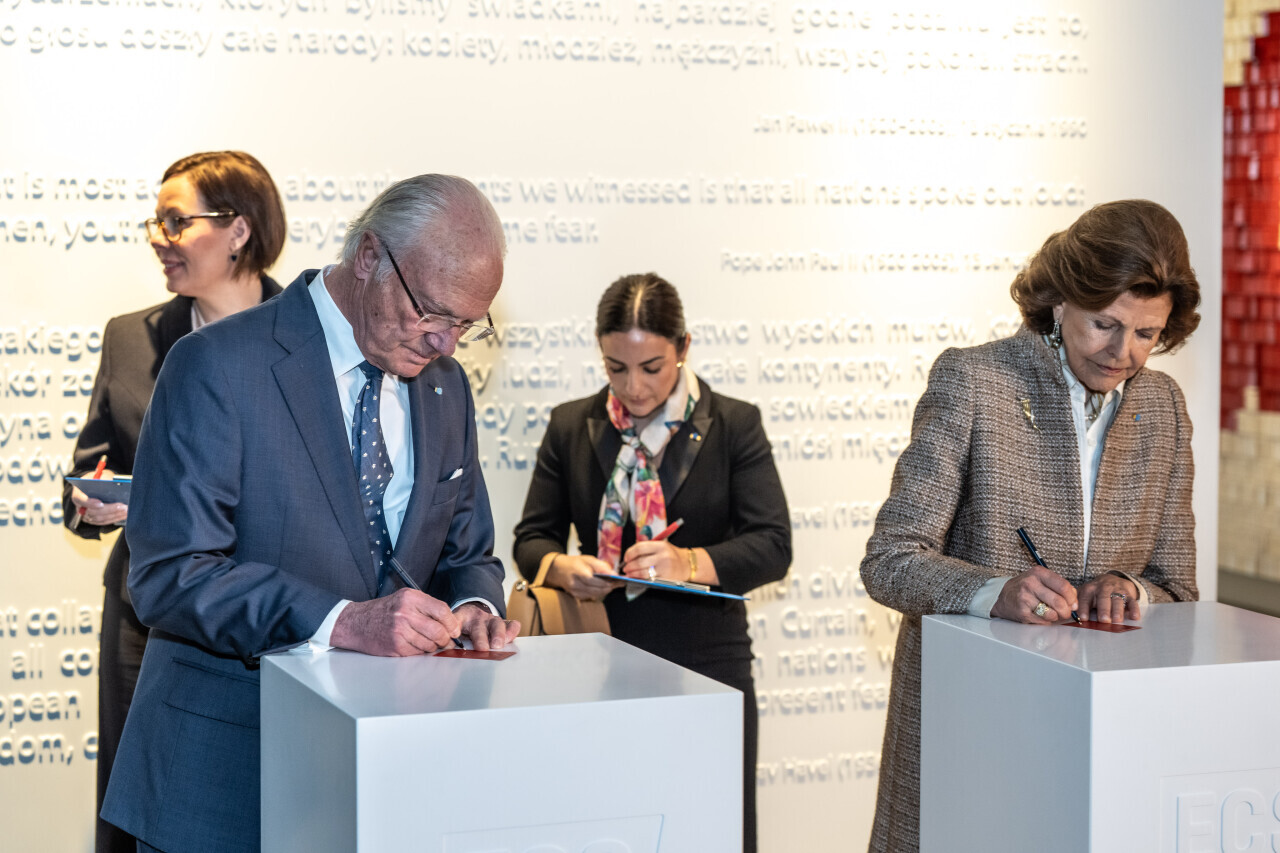 Wizyta Króla i Królowej Szwecji już w Gdańsku. Nz. Wizyta w Europejskim Centrum Solidarności i spotkanie z Lechem Wałęsą