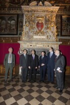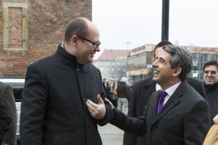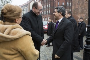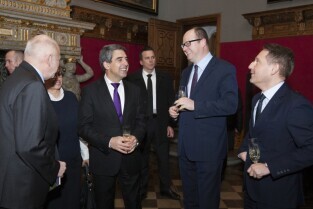 Prezydent Bułgarii Rosen Plewnelijew z wizytą w Sali Czerwonej Ratusza Głównego Miasta w Gdańsku. Nz. od lewej: Dyrektor MHMG Adam Koperkiewicz, Prezydent Bułgarii Rosen Plewnelijew, Prezydent Gdańska Paweł Adamowicz, Wicewojewoda Pomorski Michał Owczarczak