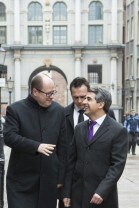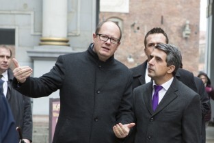 Prezydent Bułgarii Rosen Plewnelijew z wizytą w Sali Czerwonej Ratusza Głównego Miasta w Gdańsku. Nz. od lewej: Dyrektor MHMG Adam Koperkiewicz, Prezydent Bułgarii Rosen Plewnelijew, Prezydent Gdańska Paweł Adamowicz