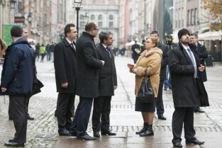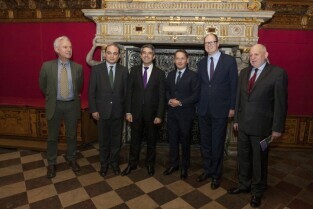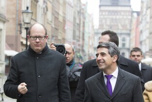 Prezydent Bułgarii Rosen Plewnelijew z wizytą w Sali Czerwonej Ratusza Głównego Miasta w Gdańsku. Nz. od lewej: Dyrektor Teatru Szekspirowskiego Jerzy Limon, Dyrektor Europejskiego Centrum Solidarności Basil Kerski, Prezydent Bułgarii Rosen Plewnelijew, Wicewojewoda Pomorski Michał Owczarczak, Prezydent Gdańska Paweł Adamowicz, Dyrektor Muzeum Historycznego Miasta Gdańska Adam Koperkiewicz
