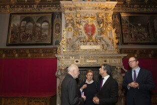 Prezydent Bułgarii Rosen Plewnelijew z wizytą w Sali Czerwonej Ratusza Głównego Miasta w Gdańsku. Po lewej Dyrektor MHMG Adam Koperkiewicz