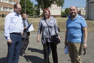 Wizyta Prezydenta Gdańska Pawła Adamowicza i jego współpracowników w dzielnicy Stogi, poprzedzająca spotkanie z mieszkańcami tej części Gdańska. Nz. od lewej: Przewodniczący Rady Dzielnicy Stogi Sławomir Szczygielski, Przewodnicząca Zarządu Dzielnicy Stogi Magdalena Wiszniewska, Prezydent Gdańska Paweł Adamowicz, Kierownik Referatu Inicjatyw i Konsultacji Społecznych UMG Maciej Kukla, z tyłu Z-ca Dyrektora Gdańskiego Zarządu Nieruchomości Komunalnych Waldemar Rydlewski
