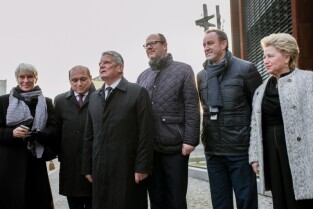 Wizyta Prezydenta Niemiec Joachima Gaucka w ECS. Nz od prawej, prezydent Gdańska Paweł Adamowicz, prezydent Niemiec Joachim Gauck, Basil Kerski - dyrektor Europejskiego Centrum Solidarności, konsul Niemiec Cornelia Pieper, Marszałek Woj. Pomorskiego Mieczysław Struk.