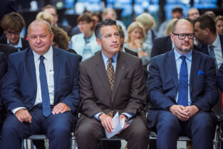 Gdańsk. Ecs. Wizyta delegacji gospodarczej ze Stanów Zjednoczonych na Pomorzu. Nz. Wiesław Byczkowski Wicemarszałek Województwa Pomorskiego, Gubernator stanu Nevada Brian Sandoval, Prezydent Gdańska Paweł Adamowicz
