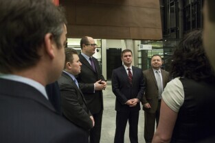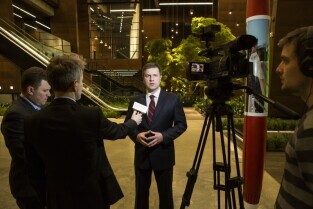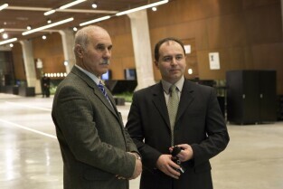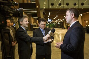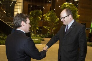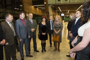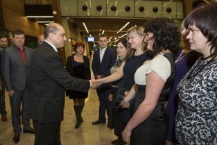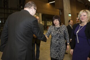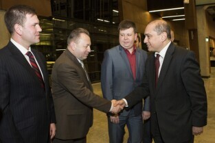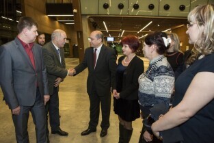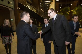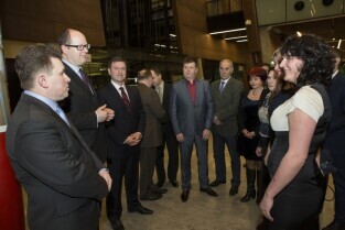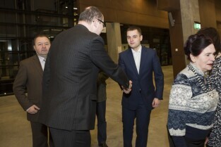 Spotkanie delegacji radnych z ukraińskiego miasta Mariupol z Prezydentem Gdańska Pawłem Adamowiczem. Gdańsk, Europejskie Centrum Solidarności. Nz. z delegacją wita się Dyrektor ECS Basil Kerski