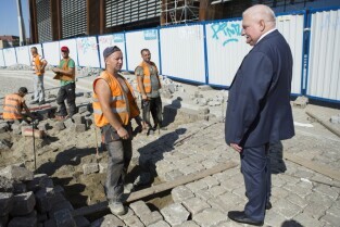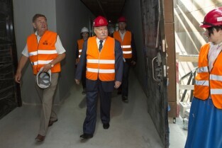 Wizyta byłego Prezydenta RP Lecha Wałęsy na budowie Europejskiego Centrum Solidarności w Gdańsku. Z tyłu Prezydent Gdańska Paweł Adamowicz