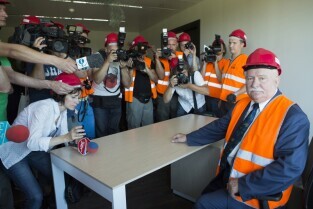 Wizyta byłego Prezydenta RP Lecha Wałęsy na budowie Europejskiego Centrum Solidarności w Gdańsku. Nz. Lech Wałęsa podpisuje kaski, które staną się częścia wystawy ECS