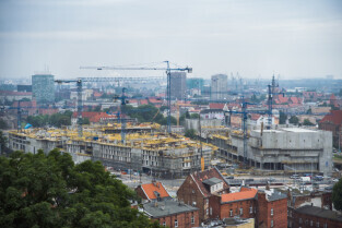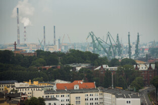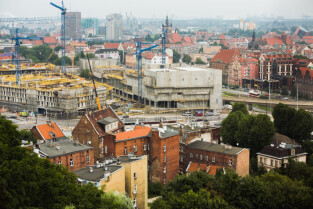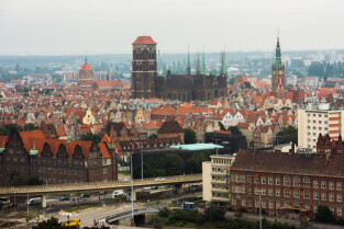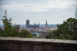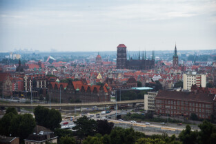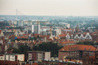 Wizyta na wieży zegarowej na Biskupiej Górce. Nz. widok z wieży zegarowej na panoramę Gdańska