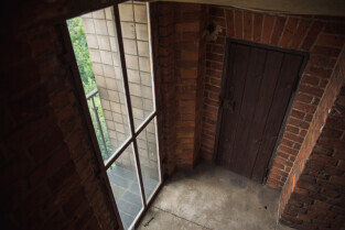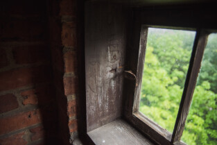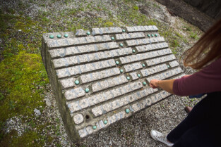 Wizyta na wieży zegarowej na Biskupiej Górce. Nz. napis wyryty przez radzieckiego żołnierza w czerwcu 45 roku