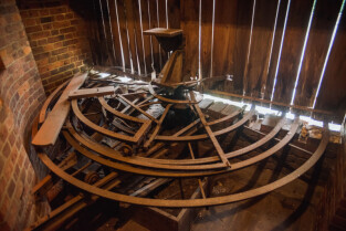 Wizyta na wieży zegarowej na Biskupiej Górce. Nz. Grzegorz Szychliński – kierownik Muzeum Nauki Gdańskiej. Znawca zegarów wieżowych pokazuje mechanizm zegara