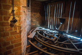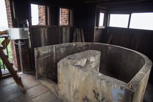 Wizyta na wieży zegarowej na Biskupiej Górce. Nz. prowadnice, po których przesuwały się modele okrętów