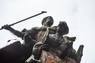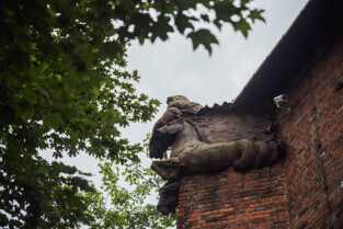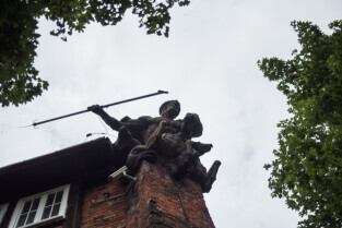 Wizyta na wieży zegarowej na Biskupiej Górce. Nz. figura Neptuna na budynku dawnego schroniska