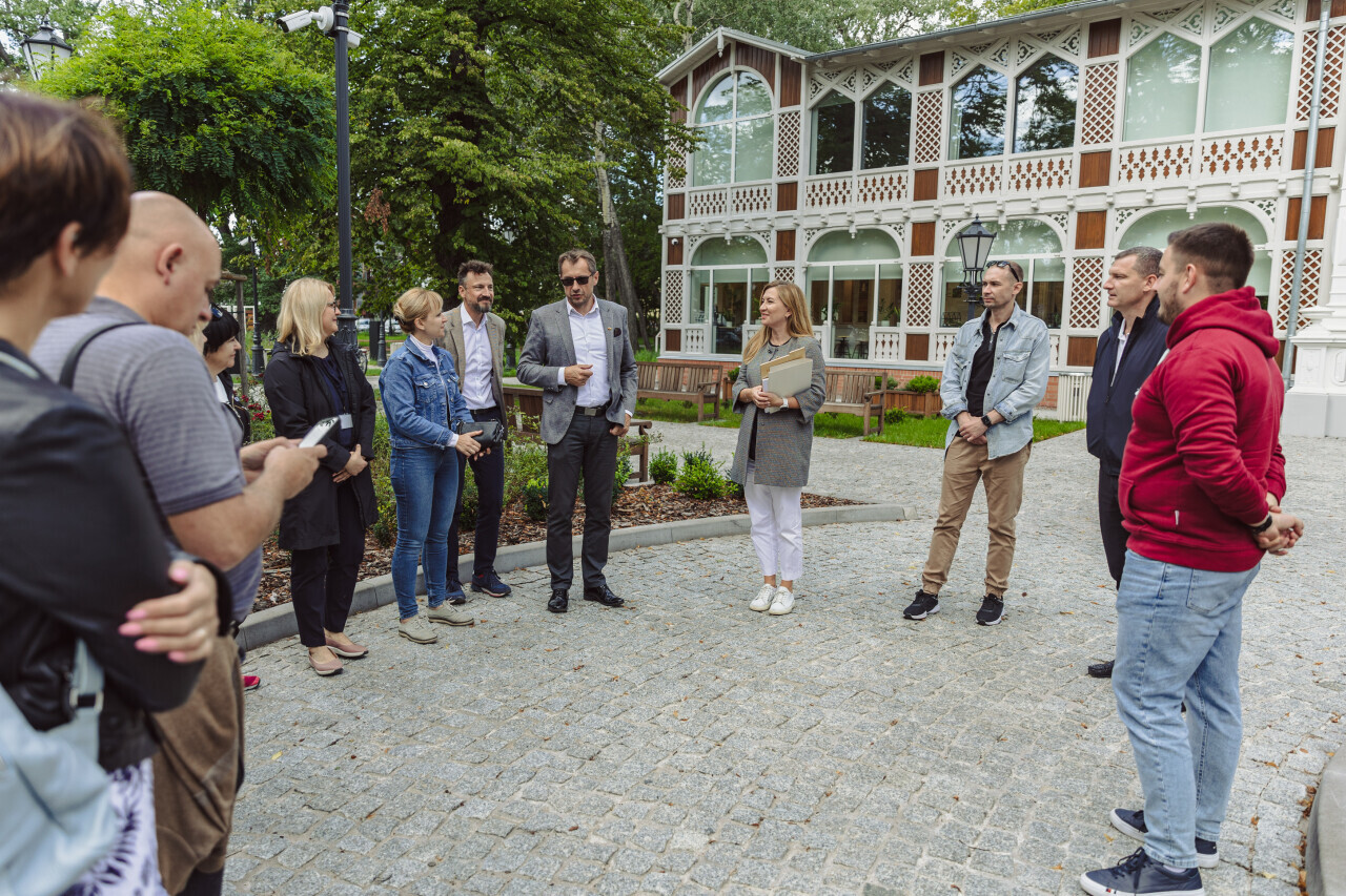 Gdańsk, Dom Zdrojowy. Wizyta studyjna 15 samorządowców z Ukrainy, zwiedzanie Domu Zdrojowego jako przykładu udanej rewitalizacji
