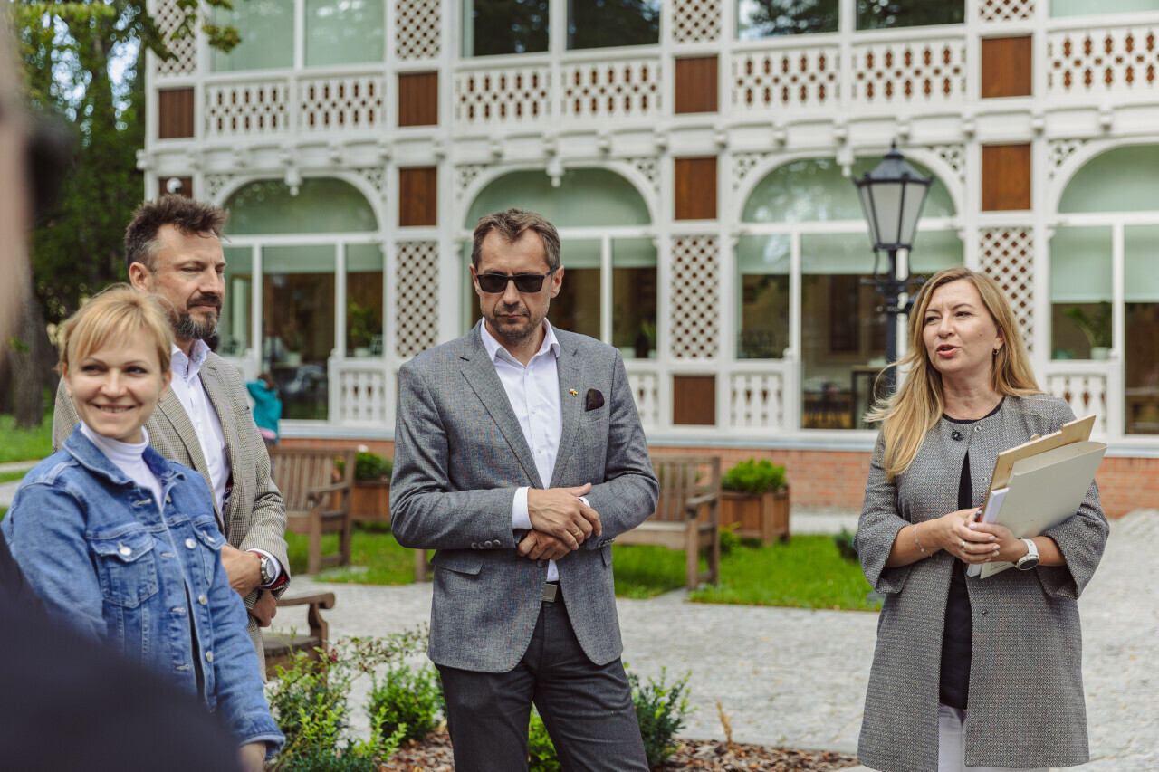 Gdańsk, Dom Zdrojowy. Wizyta studyjna 15 samorządowców z Ukrainy, zwiedzanie Domu Zdrojowego jako przykładu udanej rewitalizacji