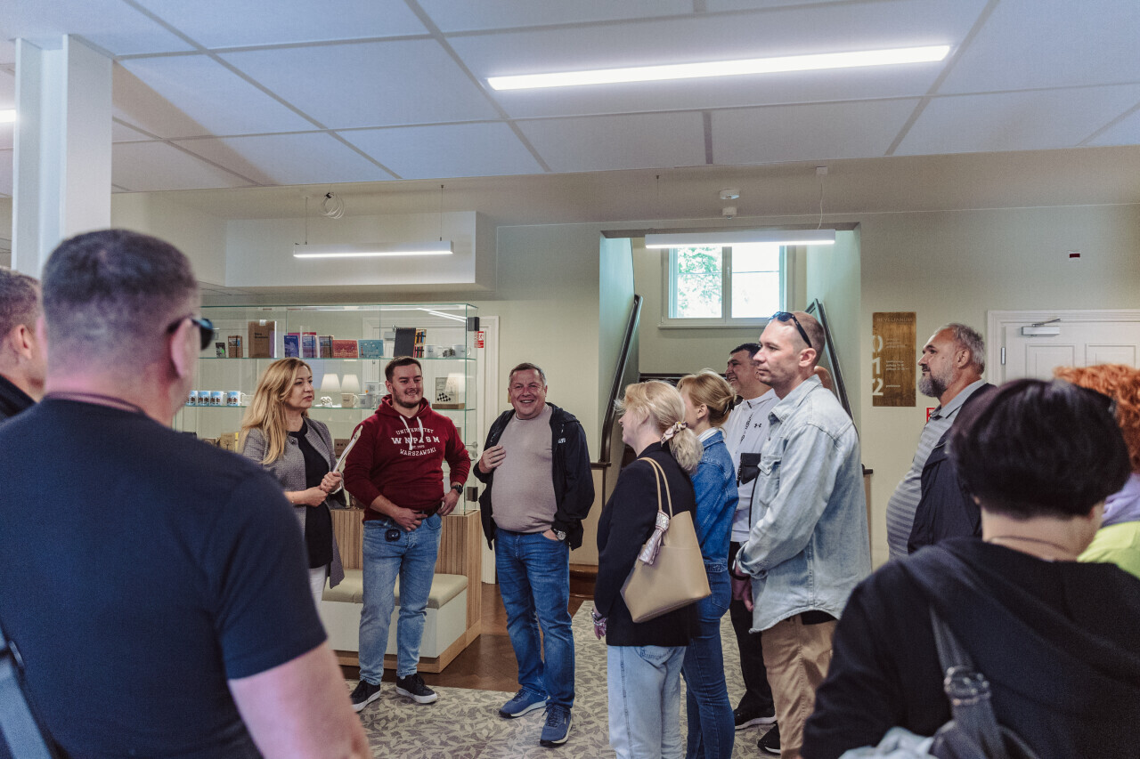 Gdańsk, Dom Zdrojowy. Wizyta studyjna 15 samorządowców z Ukrainy, zwiedzanie Domu Zdrojowego jako przykładu udanej rewitalizacji