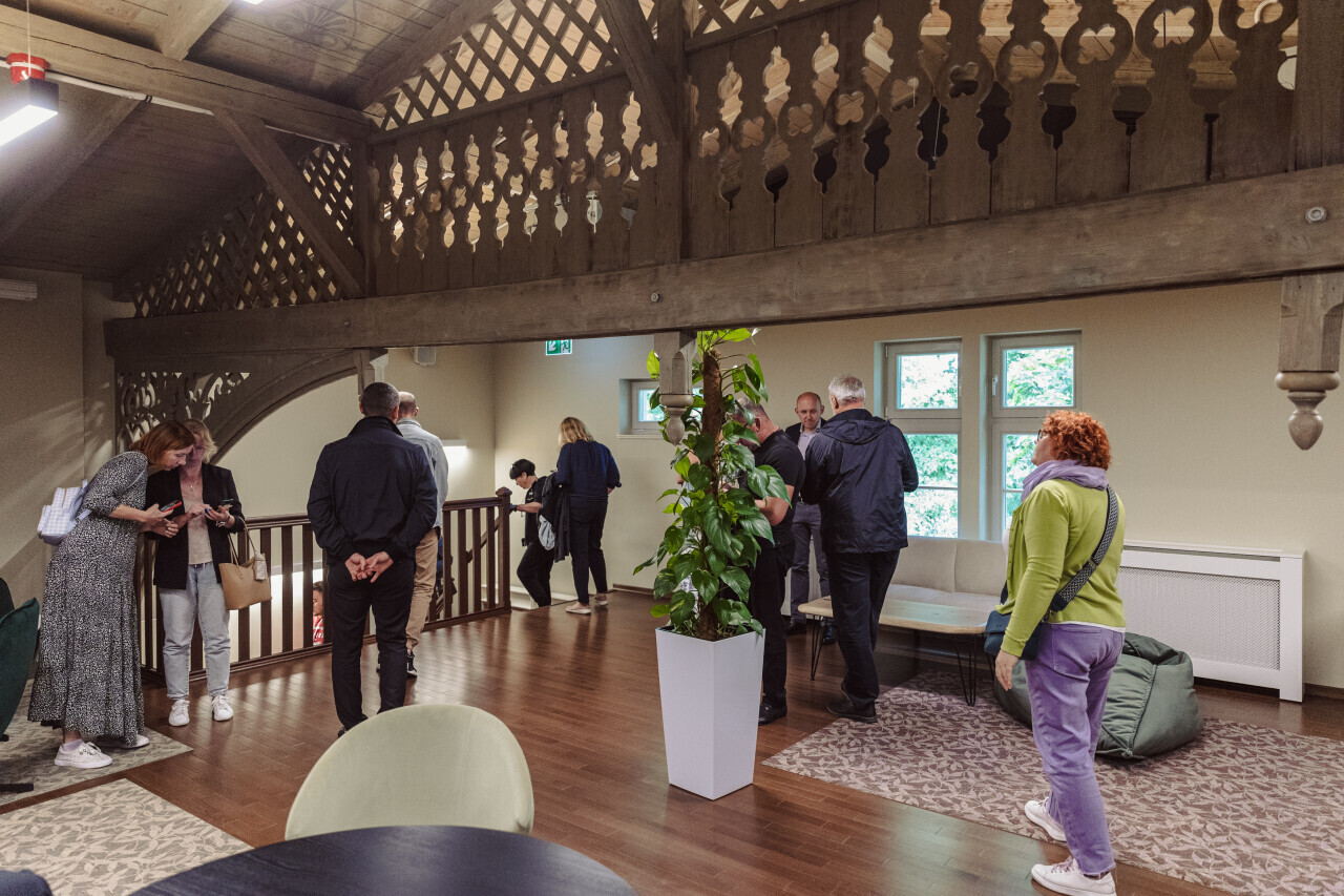 Gdańsk, Dom Zdrojowy. Wizyta studyjna 15 samorządowców z Ukrainy, zwiedzanie Domu Zdrojowego jako przykładu udanej rewitalizacji