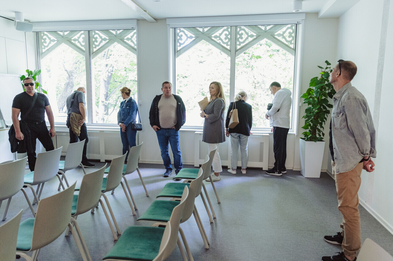 Gdańsk, Dom Zdrojowy. Wizyta studyjna 15 samorządowców z Ukrainy, zwiedzanie Domu Zdrojowego jako przykładu udanej rewitalizacji