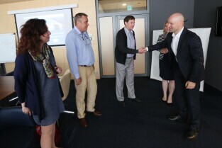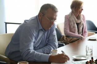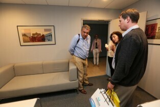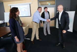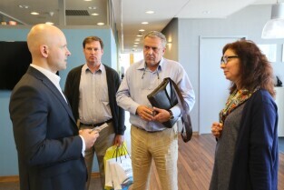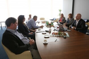 Amber EXPO. Z-ca Mera Mariupola Andrii Kargin i Oleksandr Kostenko (Dział Współpracy Zagranicznej) - samorządowcy z ukraińskiego Mariupola podczas wizyty studyjnej w Gdańsku. Spotkanie z Prezesem Zarządu InvestGDA Alanem Aleksandrowiczem.