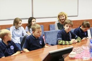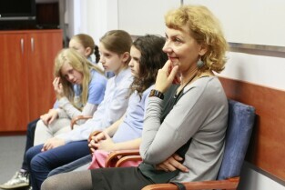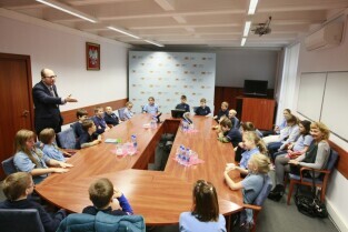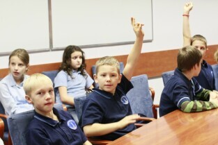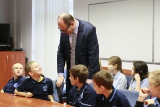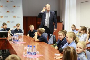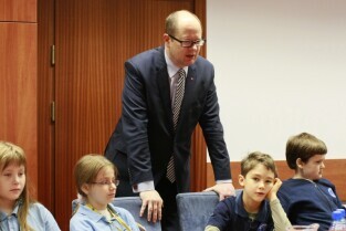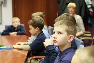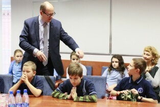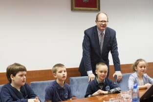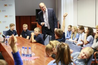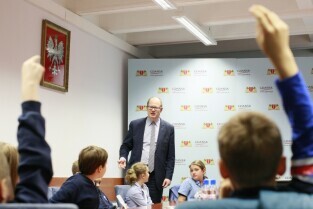 Spotkanie prezydenta Gdańska Pawła Adamowicza z uczniami czwartej klasy Szkoły Podstawowej nr 45.