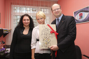 Wizyta Prezydenta Gdańska Pawła Adamowicza w gdańskim Zespole Szkół Ogólnokształcącym, ul. Subisława 22. Nz.uczennice wręczają Prezydentowi prezent z okazji 10-lecia prezydentury