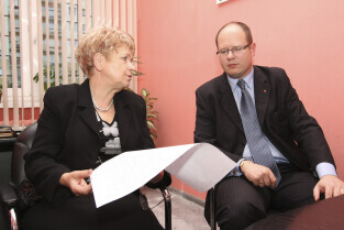Wizyta Prezydenta Gdańska Pawła Adamowicza w gdańskim Zespole Szkół Ogólnokształcącym, ul. Subisława 22. Nz. Paweł Adamowicz z dyrektor zespołu Teresą Żuk