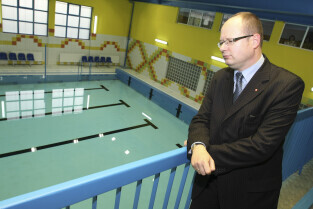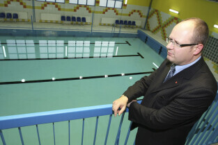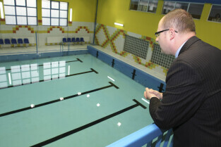 Wizyta Prezydenta Gdańska Pawła Adamowicza w gdańskim Zespole Szkół Ogólnokształcącym, ul. Subisława 22. Nz. Paweł Adamowicz ogląda basen po remoncie