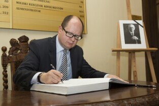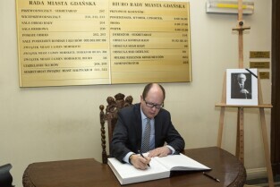 Gdańsk, Nowy Ratusz. Księga kondolencyjna wyłożona w związku ze śmiercią prof. Władysława Bartoszewskiego. Nz. wpisu dokonuje Prezydent Gdańska Paweł Adamowicz