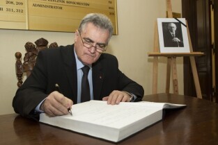 Gdańsk, Nowy Ratusz. Księga kondolencyjna wyłożona w związku ze śmiercią prof. Władysława Bartoszewskiego. Nz. wpisu dokonuje Przewodniczący Rady Miasta Gdańska Bogdan Oleszek