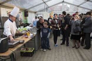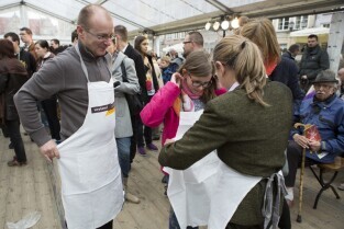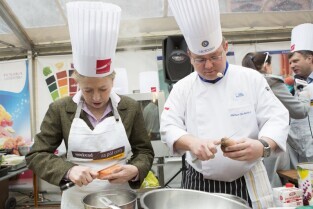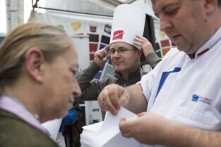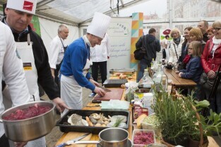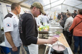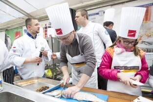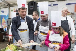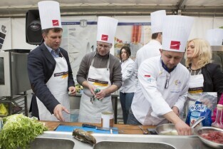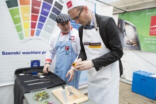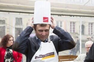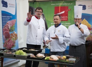 Gdańsk, Długi Targ. Wielki Show Kulinarny podczas akcji "Rozsmakuj się w Metropolii. Weekend za pół ceny". Nz. Burmistrz Nowego Dworu Gdańskiego Jacek Michalski
