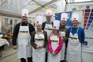 Gdańsk, Długi Targ. Wielki Show Kulinarny podczas akcji "Rozsmakuj się w Metropolii. Weekend za pół ceny". Nz. od lewej: Prezydent Tczewa Mirosław Pobłocki, Burmistrz Gniewu Maria Taraszkiewicz-Gurzyńska, Burmistrz Pruszcza Gdańskiego Janusz Wróbel, Z-ca Prezydenta Gdańska Maciej Lisicki, Burmistrz Nowego Dworu Gdańskiego Jacek Michalski