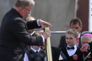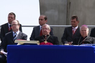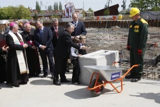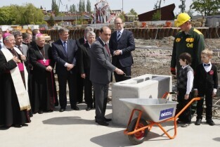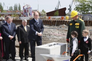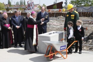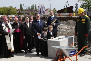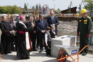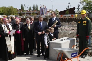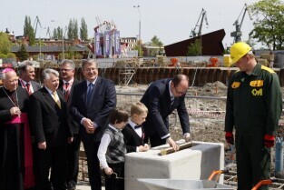 Plac Solidarności, Pomnik Poległych Stoczniowców w Gdańsku. Uroczystość wmurowania kamienia węgielnego pod siedzibę Europejskiego Centrum Solidarności.