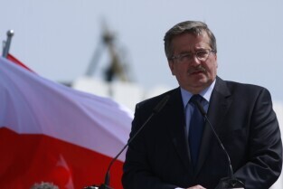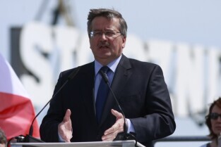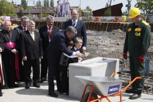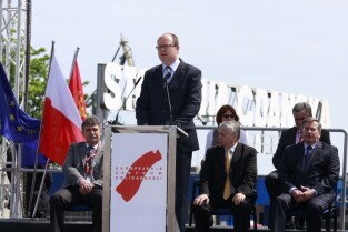 Plac Solidarności, Pomnik Poległych Stoczniowców w Gdańsku. Uroczystość wmurowania kamienia węgielnego pod siedzibę Europejskiego Centrum Solidarności. Przemawia Prezydent RP Bronisław Komorowski.