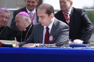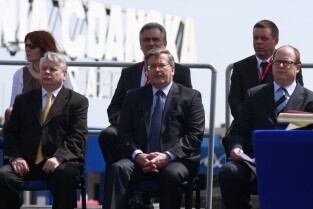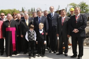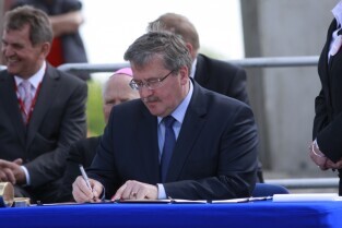 Plac Solidarności, Pomnik Poległych Stoczniowców w Gdańsku. Uroczystość wmurowania kamienia węgielnego pod siedzibę Europejskiego Centrum Solidarności. Złożenie podpisów pod Aktem Wmurowania Kamienia Węgielnego. Nz. Prezydent RP Bronisław Komorowski.
