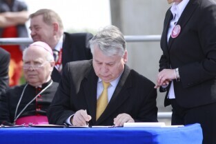 Plac Solidarności, Pomnik Poległych Stoczniowców w Gdańsku. Uroczystość wmurowania kamienia węgielnego pod siedzibę Europejskiego Centrum Solidarności. Złożenie podpisów pod Aktem Wmurowania Kamienia Węgielnego. Nz. Marszałek Senatu RP Bogdan Borusewicz.