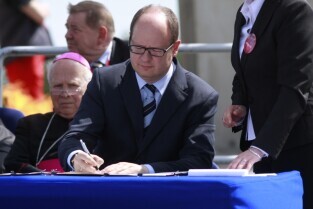 Plac Solidarności, Pomnik Poległych Stoczniowców w Gdańsku. Uroczystość wmurowania kamienia węgielnego pod siedzibę Europejskiego Centrum Solidarności. Złożenie podpisów pod Aktem Wmurowania Kamienia Węgielnego. Nz. Prezydent Gdańska Paweł Adamowicz.