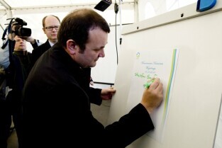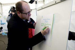 Wmurowanie kamienia węgielnego pod Instalację Termicznego Przekształcania Osadów Ściekowych. Dzięki niej zmniejszy się czterokrotnie ilość produkowanych przez oczyszczalnie osadów. Gdańsk, Oczyszczalnia Wschód.