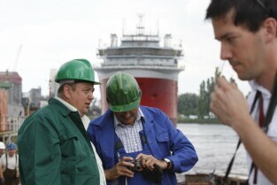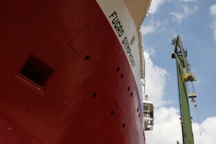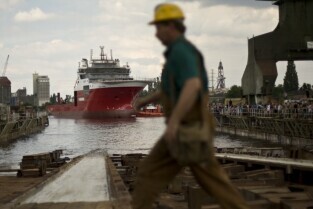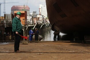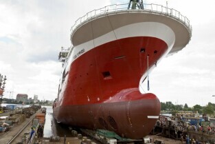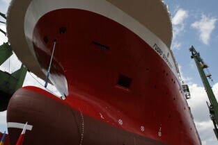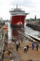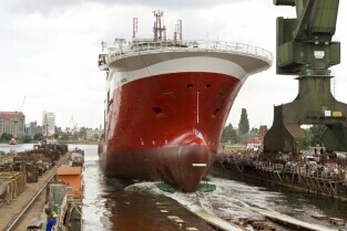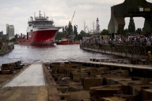 Stocznia Gdańska. Wodowanie statku Furgo Symphony (typu offshore), przeznaczonego do obsługi robót podwodnych i budowy konstrukcji morskich