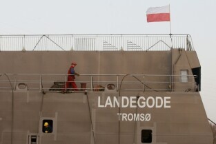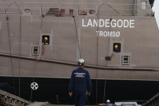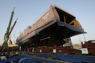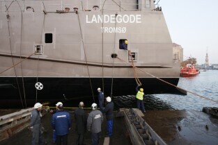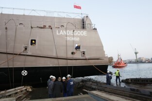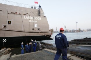 Wodowanie promu Landegode, napędzanego gazem LNG. Wymiary statku to 96 m długości i 16,8 m szerokości, a na pokład może zabrać 390 pasażerów oraz 120 aut. Jednostka będzie pływała pomiędzy wyspami Lofotów, a portem Bodo. Gdańsk, Remontowa Shipbuilding (dawna Północna).