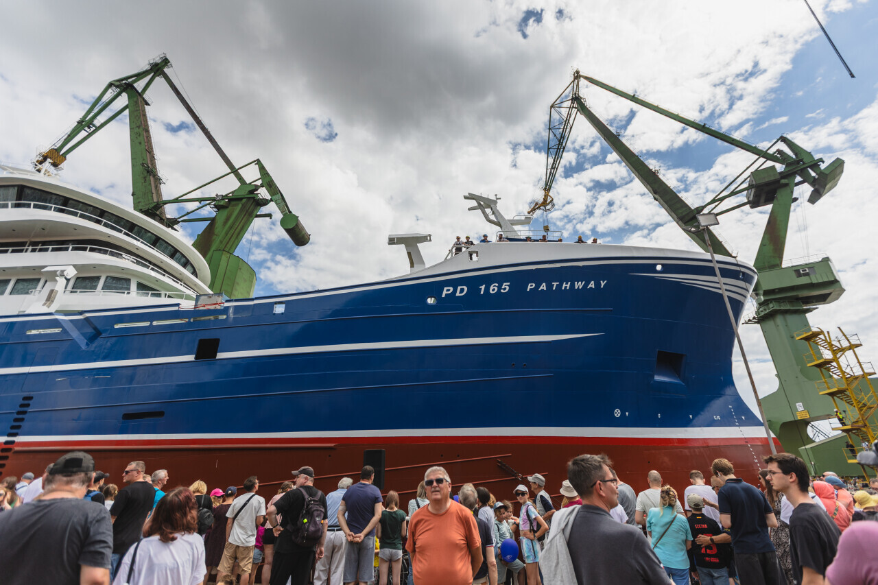 Gdańsk, ul. Traserów. Wodowanie w stoczni Karstensen Shipyard Poland. Wodowanie statku rybackiego "Pathway"