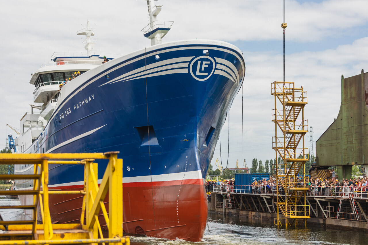 Gdańsk, ul. Traserów. Wodowanie w stoczni Karstensen Shipyard Poland. Wodowanie statku rybackiego "Pathway"