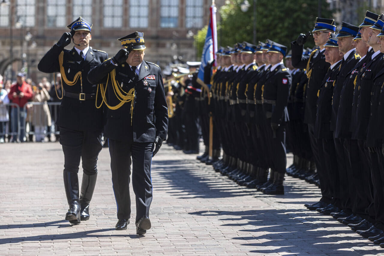 Gdańsk. Na Długim Targu odbył się uroczysty apel z okazji Wojewódzkich Obchodów Dnia Strażaka. W uroczystościach udział wzięli Wojewoda Pomorska Beata Rutkiewicz, Wicemarszałek woj. pomorskiego Leszek Bonna oraz Piotr Borawski, Z-ca Prezydenta ds. mobilności i bezpieczeństwa