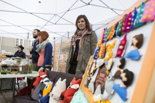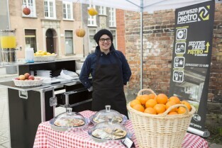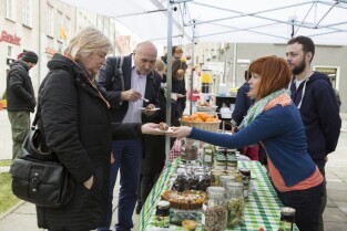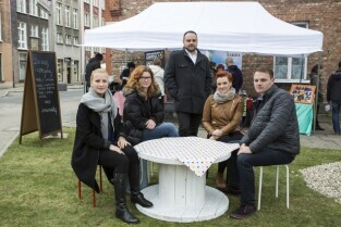 Gdańsk, pl. T. Polaka przy ul. Ogarnej. Konferencja prasowa poprzedzająca organizację "Wolnego Targu". Nz. organizatorzy Targu, od lewej: Anna Włodarczyk, Magdalena Kosakowska, Jakub Żelazny, Katarzyna Błaszczyk i Tomasz Skowroński