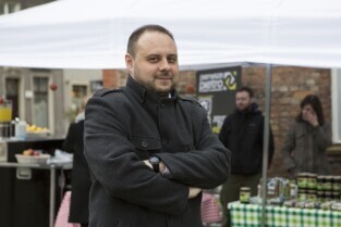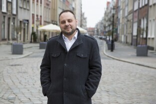 Gdańsk, pl. T. Polaka przy ul. Ogarnej. Konferencja prasowa poprzedzająca organizację "Wolnego Targu". Nz. Menadżer Śródmieścia Jakub Żelazny