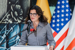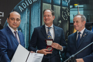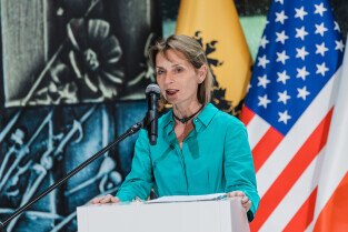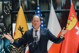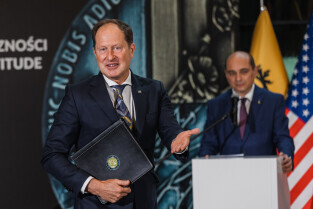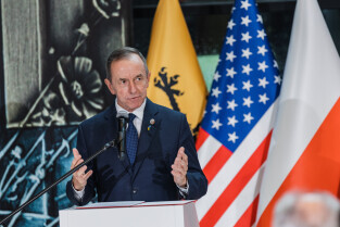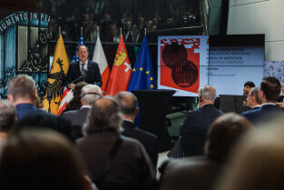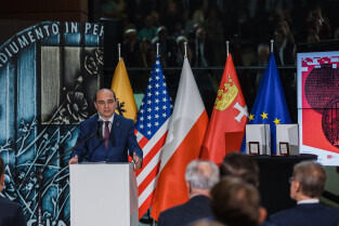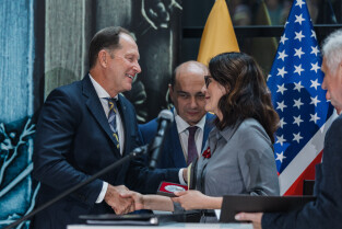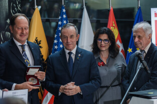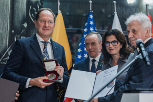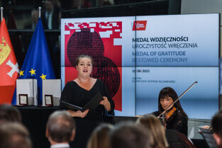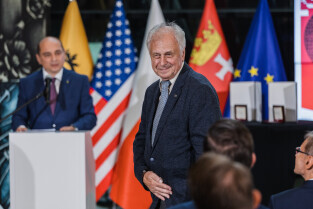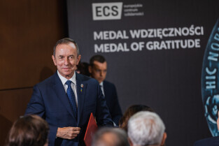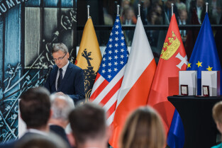 Gdańsk, ECS. Wręczenie Medalu Wdzięczności. Tegoroczni laureaci to Zbigniew Brzeziński i Emilie Benes Brzeziński (pośmiertnie). Medale odbiera Mark Brzezinski - syn laureatów, ambasador Stanów Zjednoczonych w Polsce. Laudacje wygłaszają: Jerzy Koźmiński - były ambasador RP w Waszyngtonie oraz Iwona Dorota Bigos - dyrektorka i założycielka Gdańskiej Galerii Miejskiej.